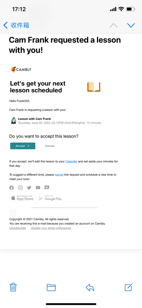 Cambly外教仅可以向他/她的Regular Student发起预约邀请,等待用户接受后预约即可确认。