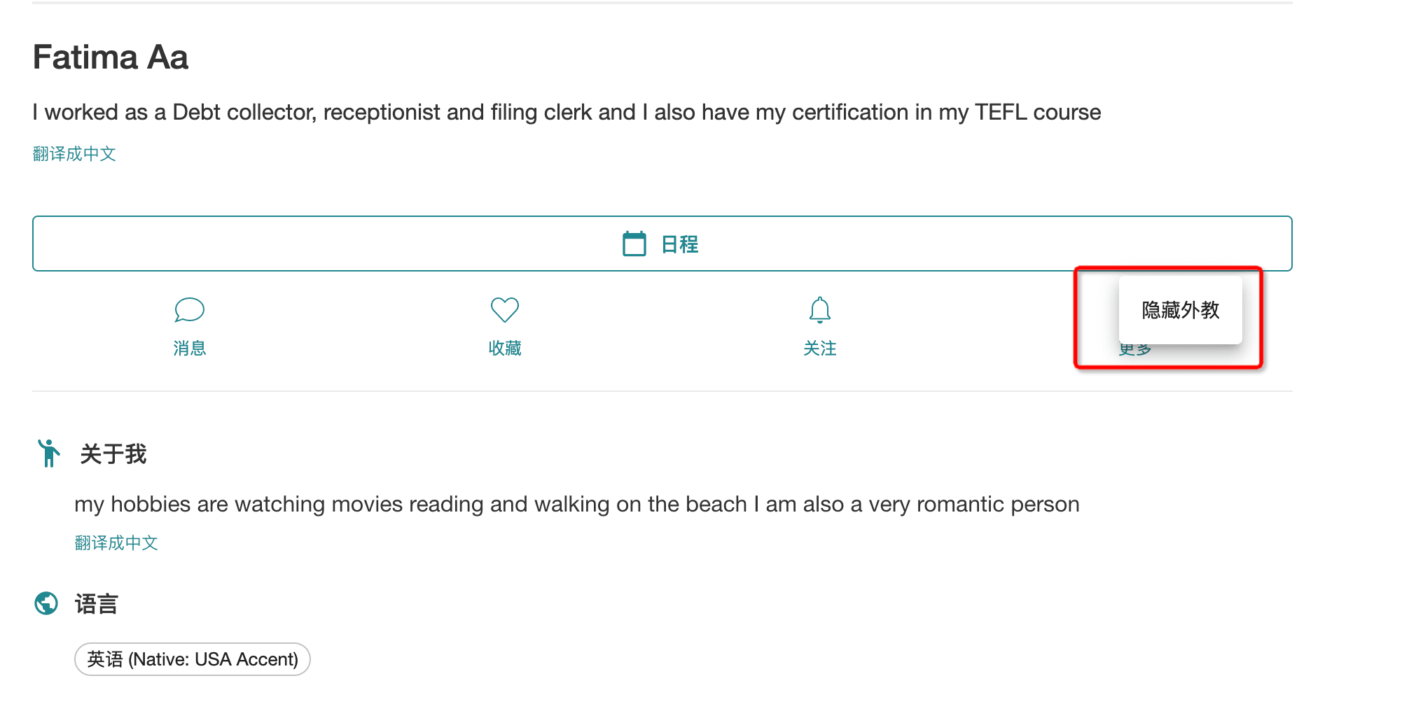同时我们也理解,您可能只是不喜欢外教的教学方式或其他原因不想再和同一位外教上课,您可以在外教资料页面右上角选择”隐藏外教“,隐藏后外教不再会出现在您的外教列表页面中。