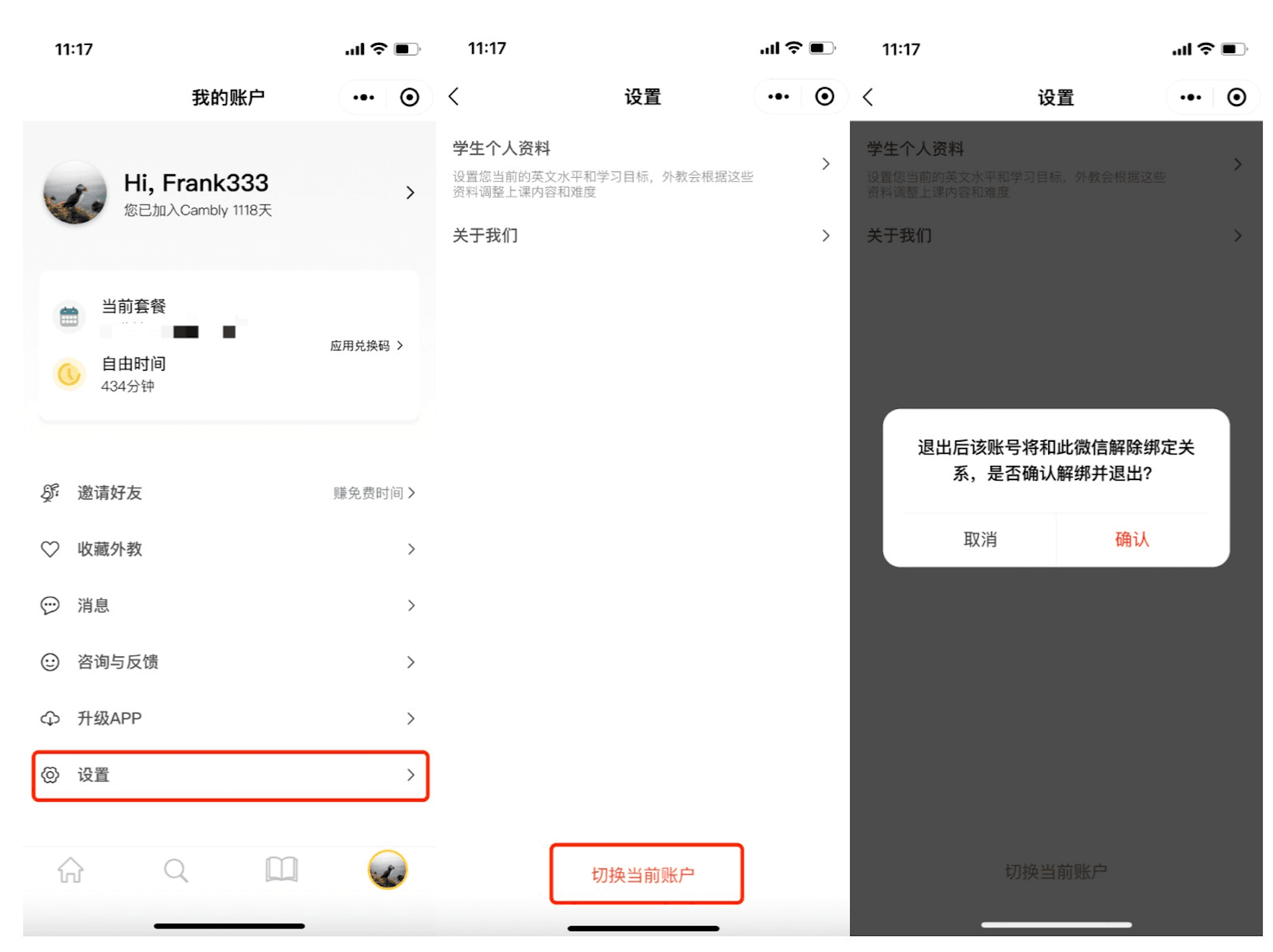 4. 有多个Cambly账号,需要更换账号登录小程序