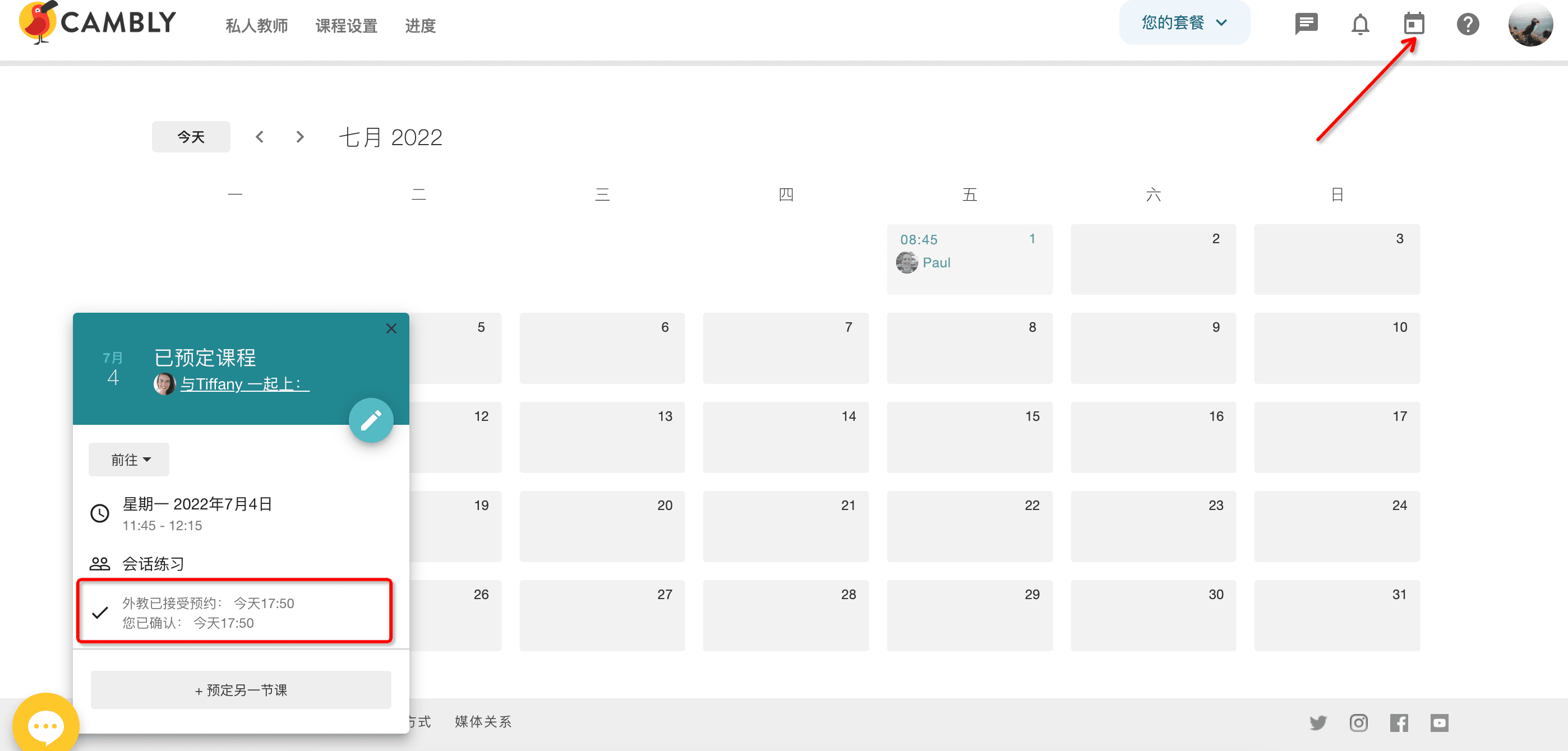 预约外教的课程后,可以前往网页版右上角的【日历】图标处查看您所预约课程的详细预约状态。